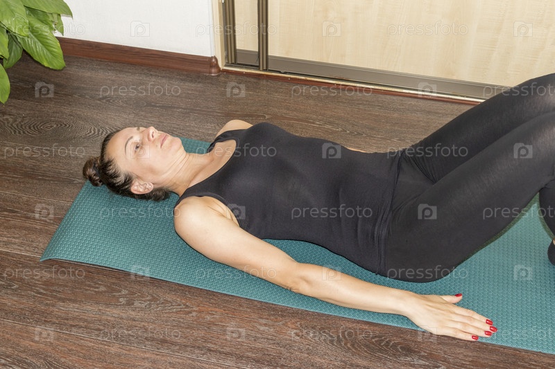 Снимок женщины, выполняющей различные упражнения на растяжку и физические упражнения, лежащей на коврике для йоги на полу. Стиль жизни