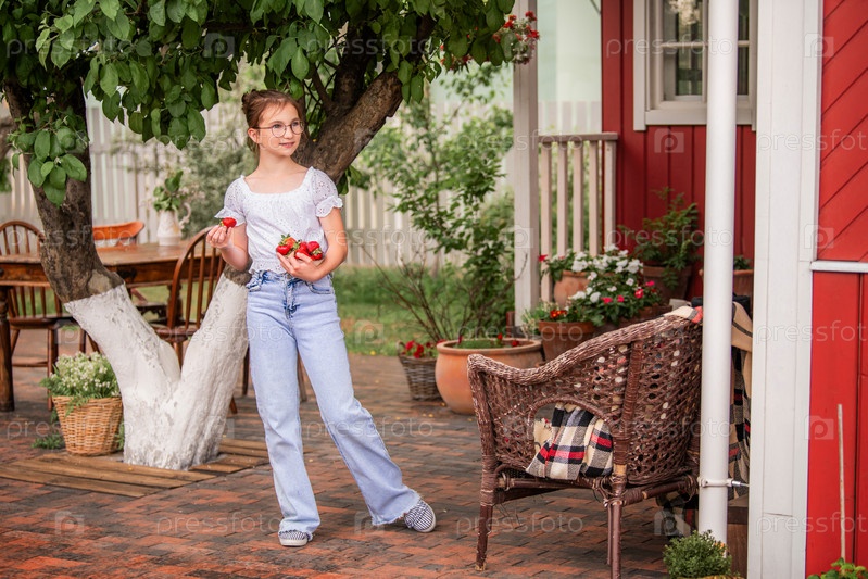 Девушка стоит с тарелкой клубники в деревенском летнем саду, в окружении природы