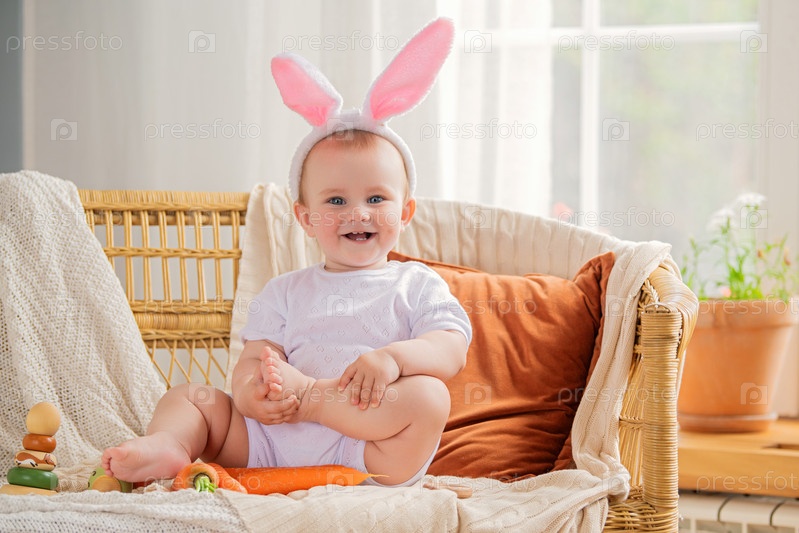 Ребенок в белой шапочке с кроличьими ушками сидит на диване с морковкой в руке