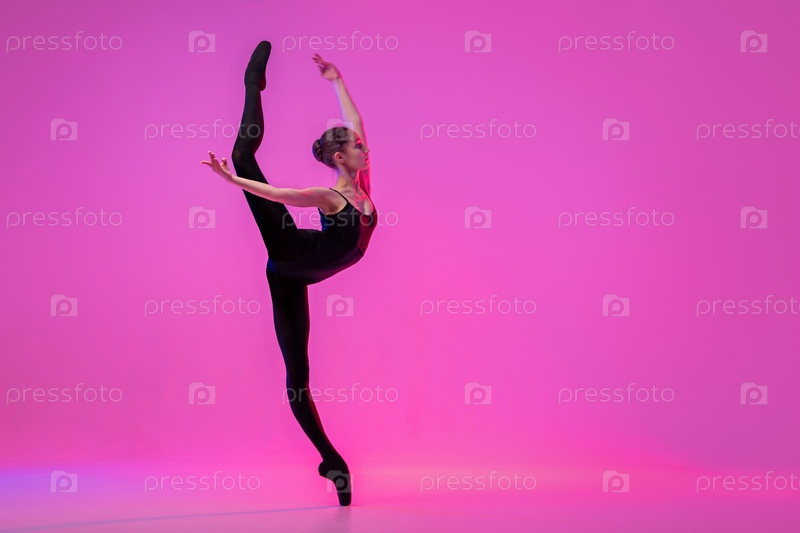 Молодая балерина в пуантах танцует в черном купальнике и купальнике на красном фоне