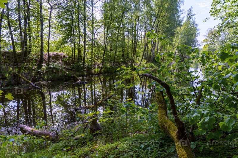 Лесной пейзаж летом. Река в лесу. Отражение деревьев в реке
