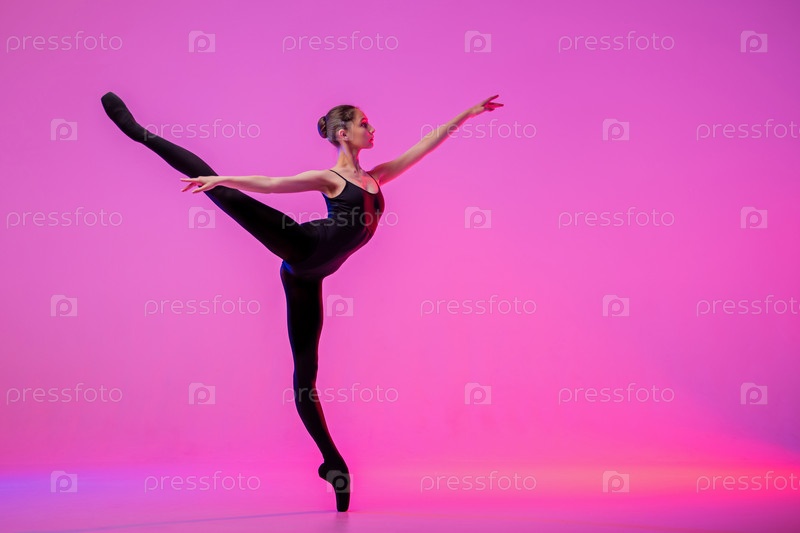 Молодая балерина в пуантах танцует в черном купальнике и купальнике на красном фоне