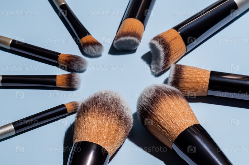 Кисти для макияжа расположены по кругу на синем фоне. Профессиональный консилер для макияжа, румяна, тени для век