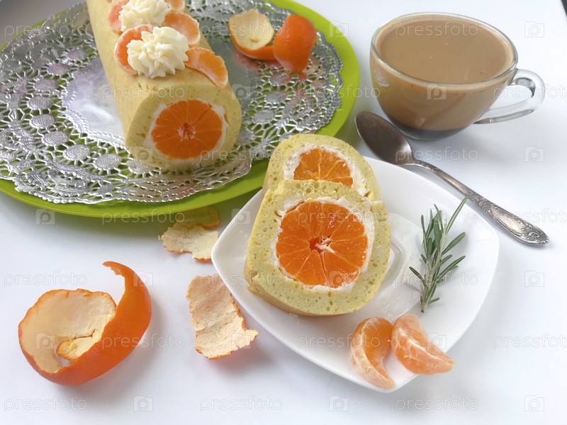 Готовим бисквитный рулет с начинкой из рикотты и мандарина. Готовый рулет лежит на блюде. Дальше на блюдце – отрезанный кусок рулета