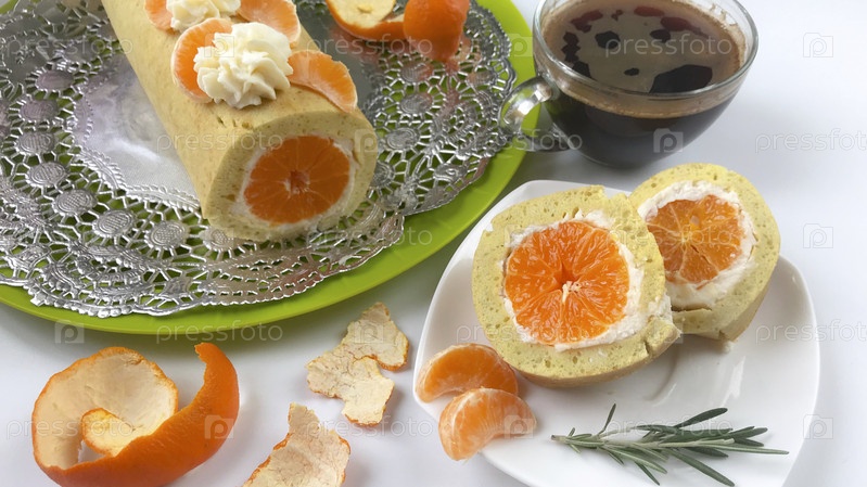 Готовим бисквитный рулет с начинкой из рикотты и мандарина. Готовый рулет лежит на блюде. Дальше на блюдце – отрезанный кусок рулета