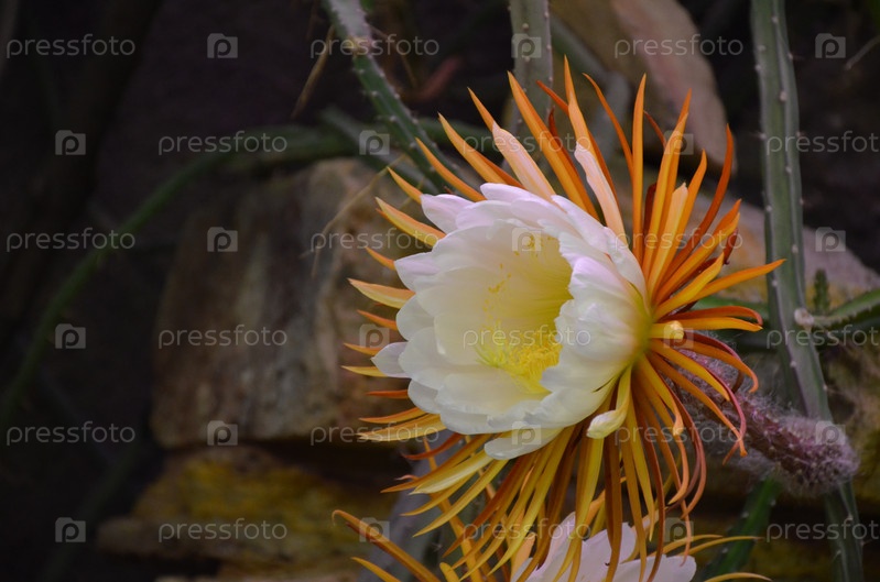 Цветение Селеницереус крупноцветочный (лат. Selenicereus grandiflorus, царица ночи грандифлоры, семья кактусов) в Ботаническом саду Петра Великого, Санкт-Петербург
