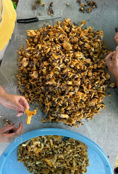 Грибники сортируют и чистят собранные лисички. Грибы разложены на столе