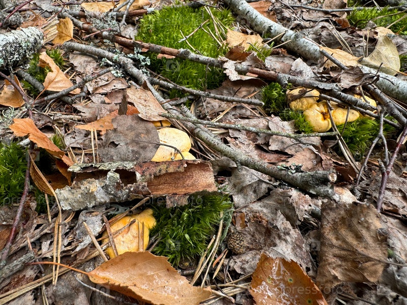 Лисички растут среди лесного хвороста и опавших листьев березы