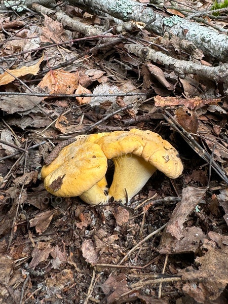 Лисички растут среди опавших листьев березы и лесного хвороста