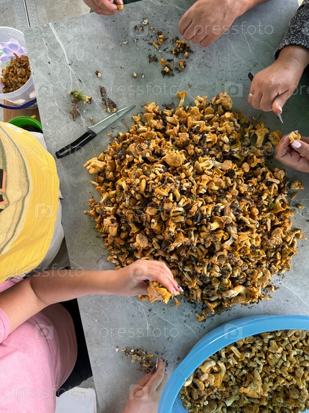 Грибники сортируют и чистят собранные лисички. Грибы разложены на столе