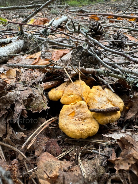 Лисички растут среди опавших листьев березы