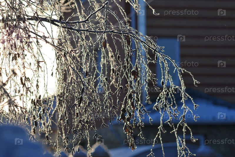 Ветви деревьев, покрытые инеем в первых лучах солнца