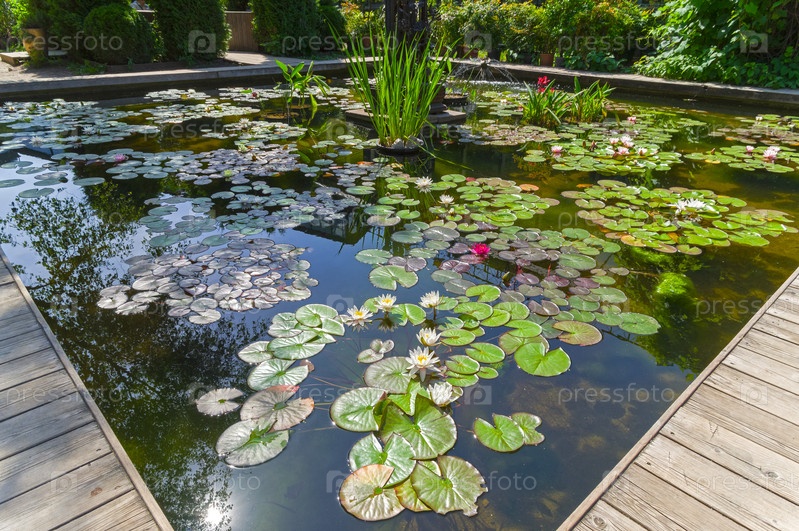 Разноцветные цветущие водяные лилии в маленьком пруду. Аптекарский Огород (филиал ботанического сада МГУ). Москва, июль, солнечно