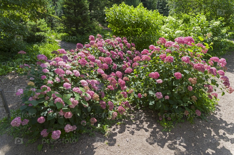 Цветущая розовая гиртензия сорта Annabelle (лат. Hydrangea arborescens) в Аптекарском саду (филиал ботанического сада МГУ). Москва. июль, солнечный