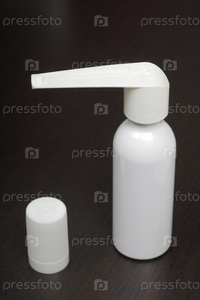 Ингалятор для лечения органов дыхания. Баллончик с распылителем и колпачок белого цвета. На темной поверхности