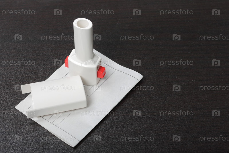 Ингалятор для лечения органов дыхания. Баллончик с распылителем и колпачок белого цвета. Следующий рецепт, который стоит купить. На темной поверхности