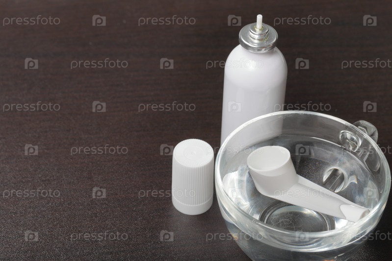 Ингалятор для лечения органов дыхания. Баллончик с распылителем и колпачок белого цвета. Наконечник замачивается в воде от высыхания. На темной поверхности