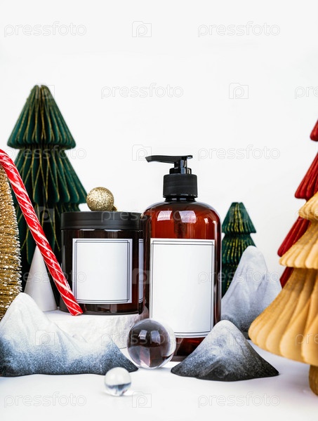 Темная банка с крышкой и дозатором на фоне рождественских украшений, вид сбоку