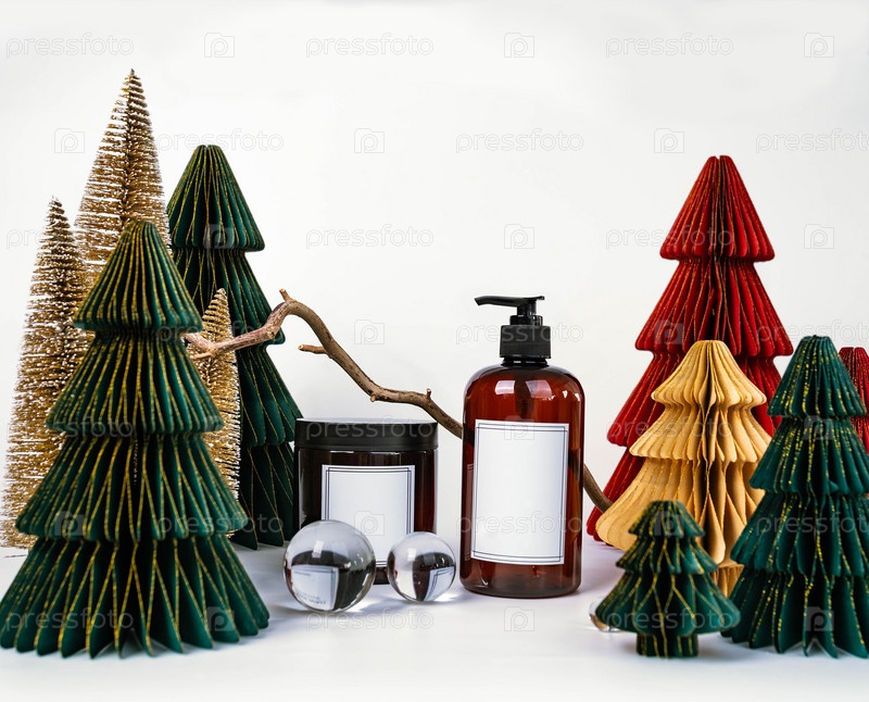 Темная банка с крышкой и дозатором на фоне рождественских украшений, вид сбоку