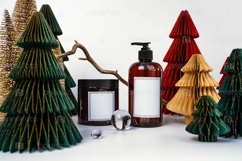 Темная банка с крышкой и дозатором на фоне рождественских украшений, вид сбоку