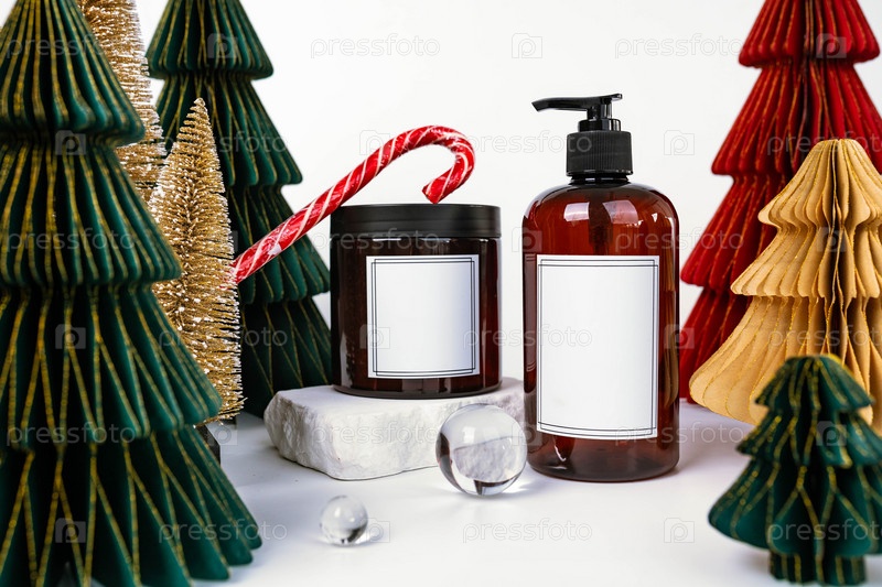 Темная банка с крышкой и дозатором на фоне рождественских украшений, вид сбоку