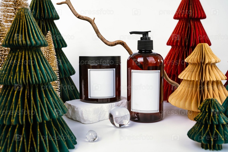Темная банка с крышкой и дозатором на фоне рождественских украшений, вид сбоку