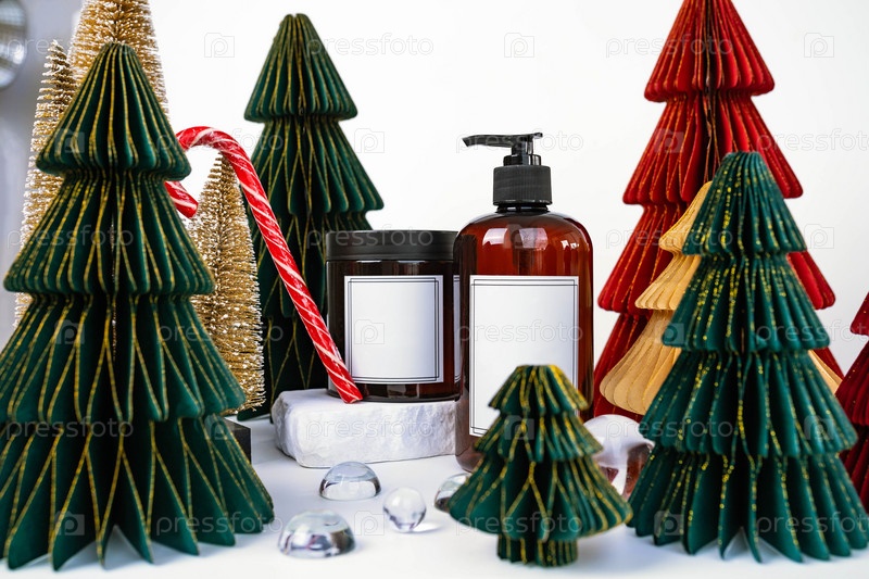 Темная банка с крышкой и дозатором на фоне рождественских украшений, вид сбоку