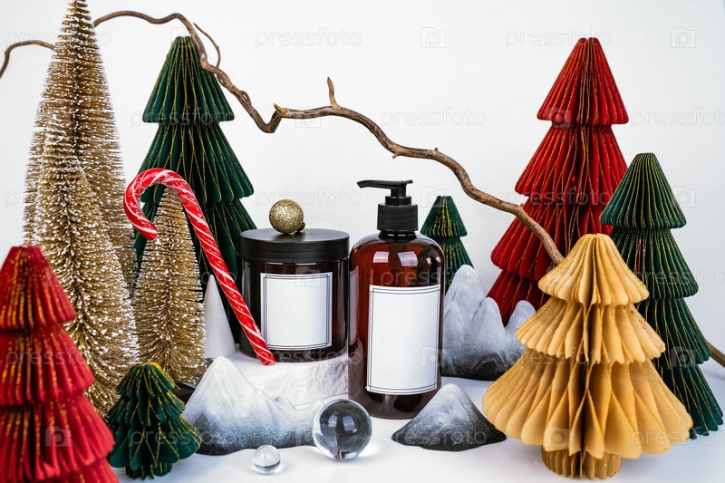 Темная банка с крышкой и дозатором на фоне рождественских украшений, вид сбоку