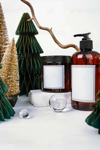 Темная банка с крышкой и дозатором на фоне рождественских украшений, вид сбоку