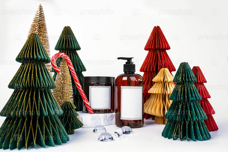 Темная банка с крышкой и дозатором на фоне рождественских украшений, вид сбоку