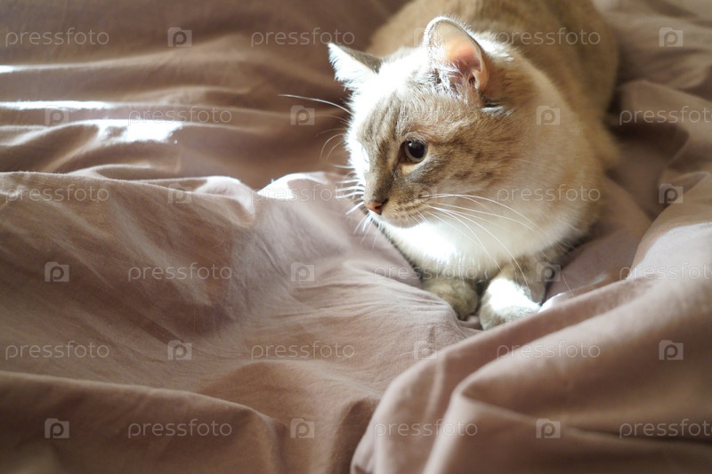 Вид спереди милой красивой кошки сиамской породы на классическом коричневом одеяле