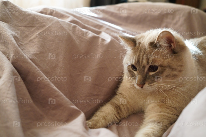 Вид спереди милой красивой кошки сиамской породы на классическом коричневом одеяле