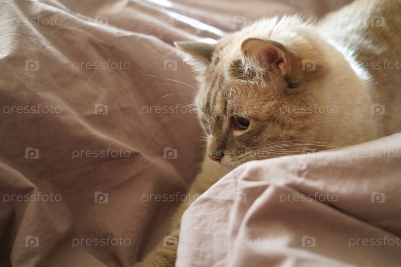 Вид спереди милой красивой кошки сиамской породы на классическом коричневом одеяле