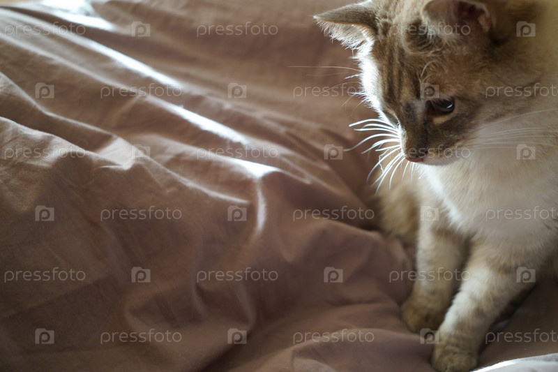 Вид спереди милой красивой кошки сиамской породы на классическом коричневом одеяле