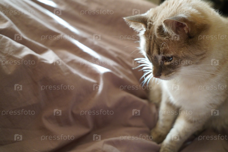 Вид спереди милой красивой кошки сиамской породы на классическом коричневом одеяле