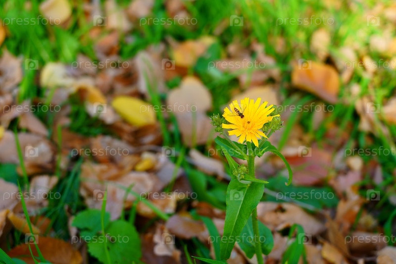 Осенний желтый цветок и пчела на нем. . Вид сбоку