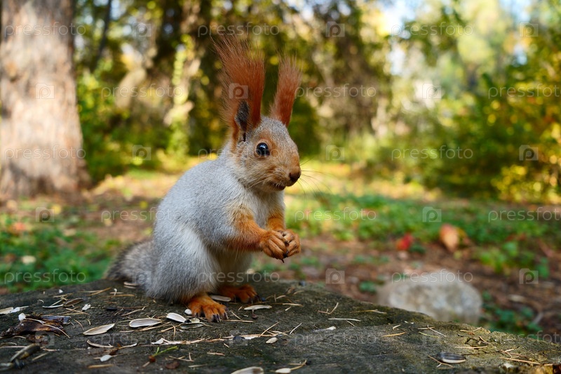 Серая лесная белка ест семена на пне. Осенний лес. Вид сбоку