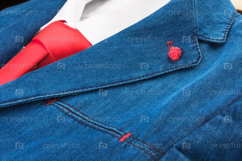 Крупным планом джинсовый костюм и красный галстук