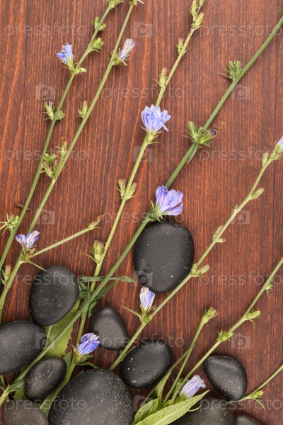 Красивые голубые полевые цветы и черные камни на деревянной поверхности