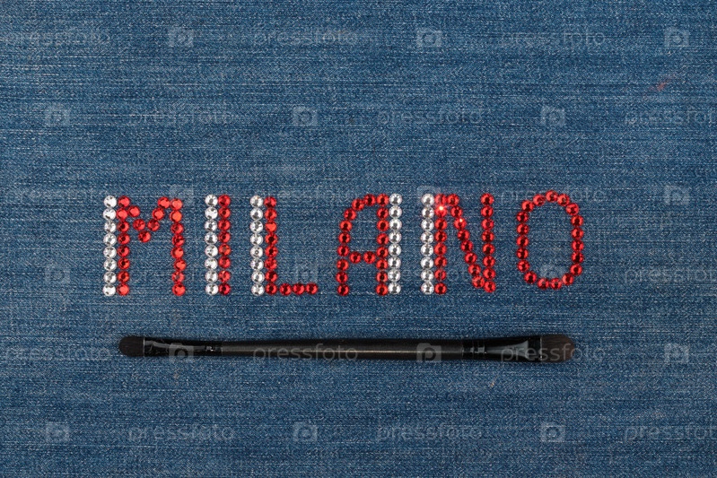 Надпись Milano, инкрустация строками на ткани джинсов.Вид сверху