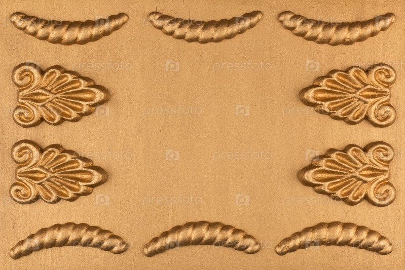 Роскошная рама из золотой лепнины, лежащая на золотой поверхности. Место для текста, пространство для копирования. Вид сверху