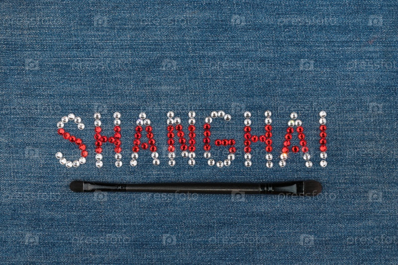 Надпись Шанхай, инкрустация строками на джинсовой ткани. вид сверху