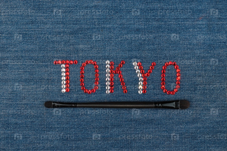 Надпись Токио, инкрустация стразами на джинсовой ткани. Вид сверху