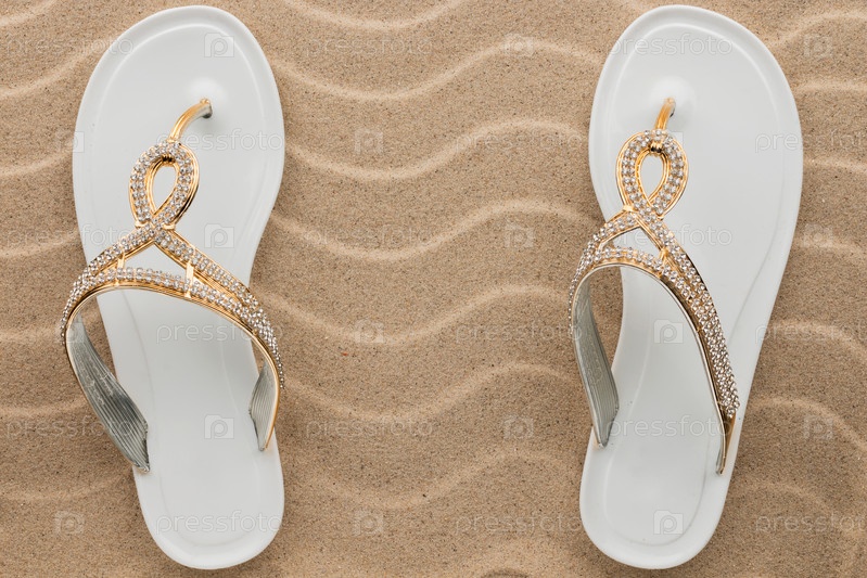 Пара белых пляжных сандалий со стразами стоит на песке