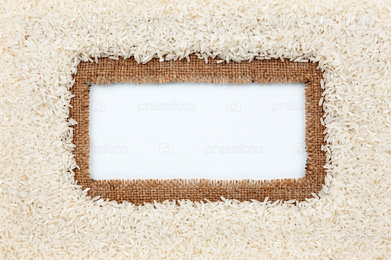 Рамка из мешковины и рисовых зерен лежит на белом фоне