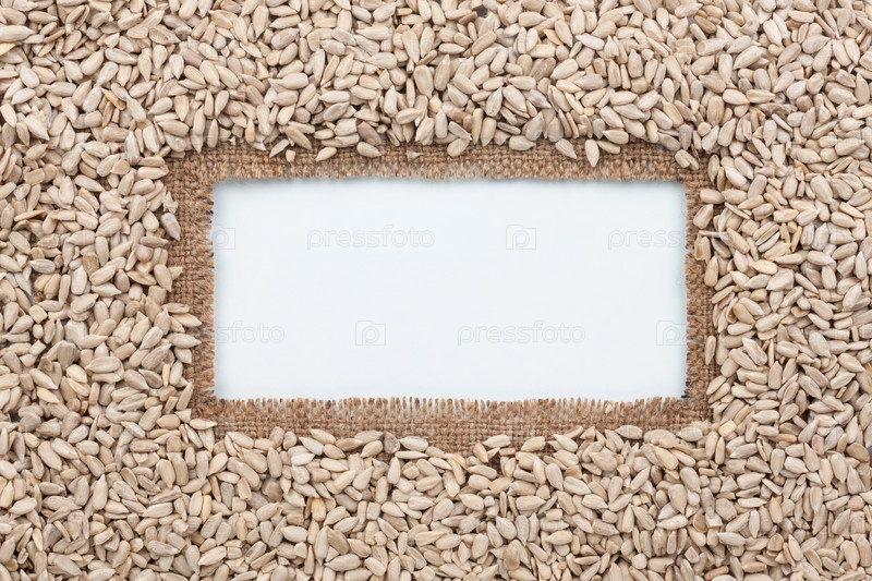 Рамка из мешковины и семян подсолнечника лежит на белом фоне
