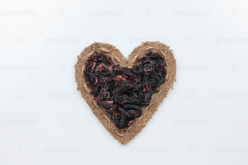 Сушеный гибискус лежит в сердце из мешковины