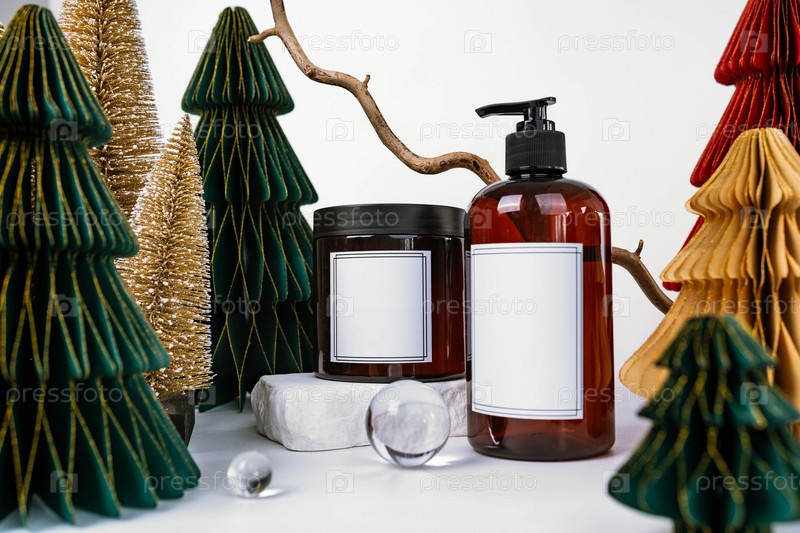 Темная банка с крышкой и дозатором на фоне рождественских украшений, вид сбоку