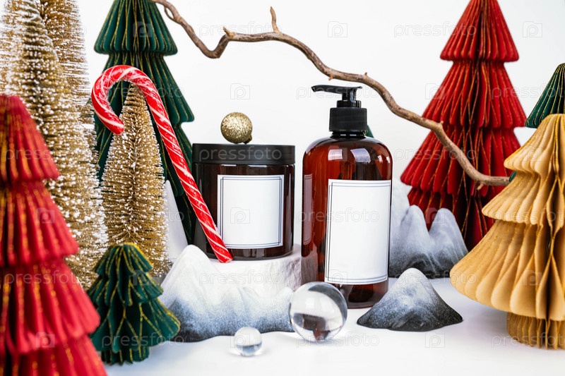 Темная банка с крышкой и дозатором на фоне рождественских украшений, вид сбоку
