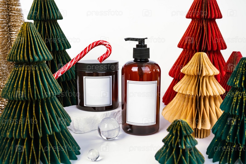 Темная банка с крышкой и дозатором на фоне рождественских украшений, вид сбоку
